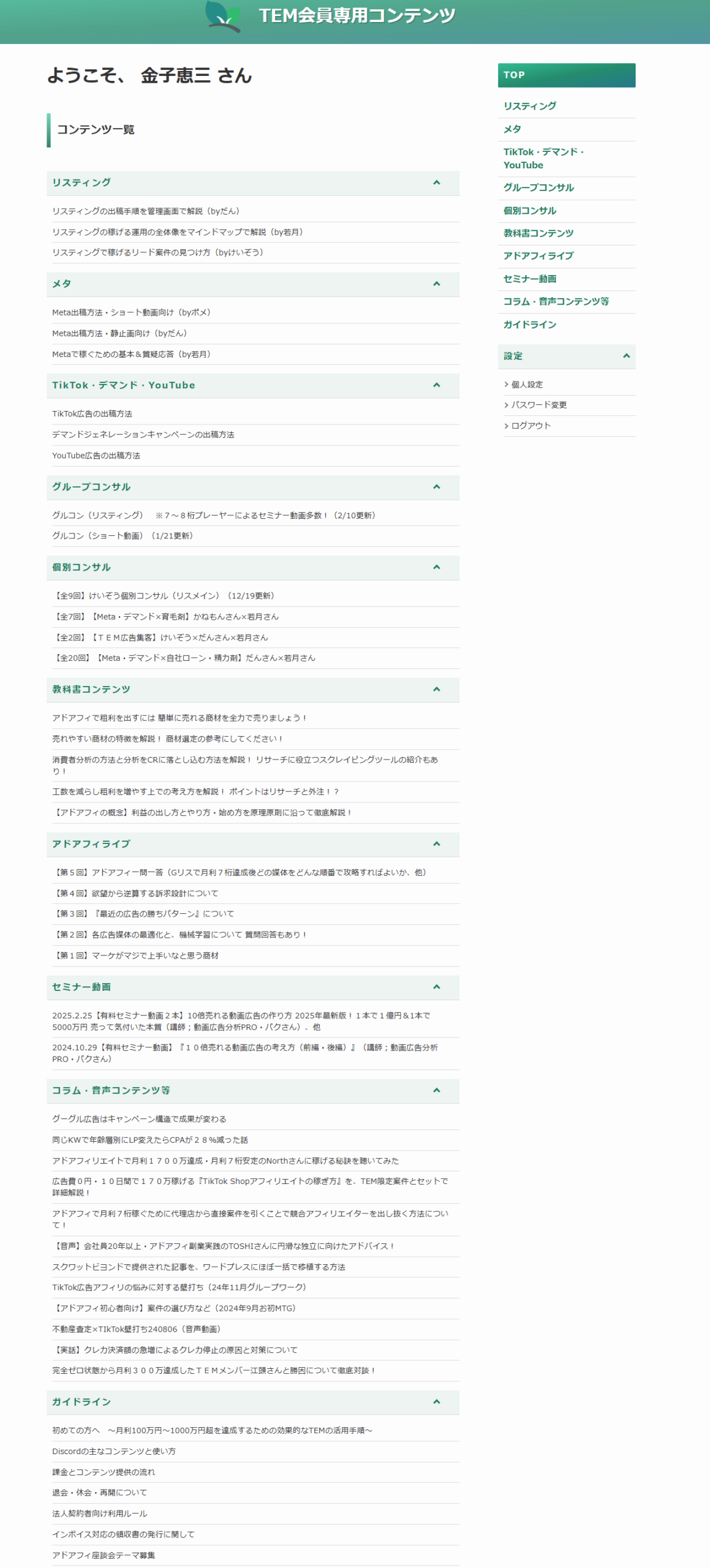 - PPCアフィリショートセミナー動画(月利8桁・7桁達成したTEMメンバーが講師)